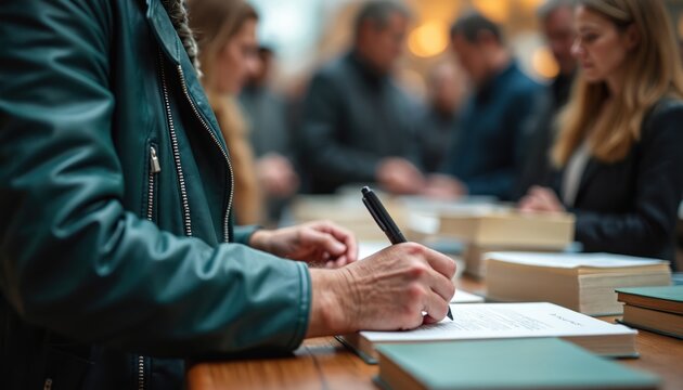Author signing autograph in own book at wooden table