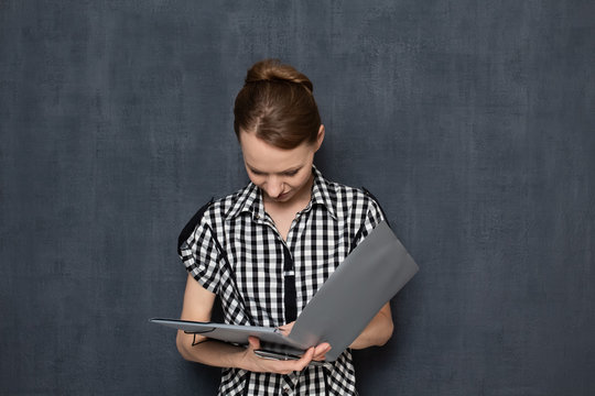 Busy 40 years old business woman working in office checking documents. Mid aged businesswoman accounting manager executive or lawyer using laptop reading paper file financial report, tax invoice