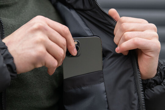 The man puts the phone in the inner pocket of his black jacket. Hands with phone close-up