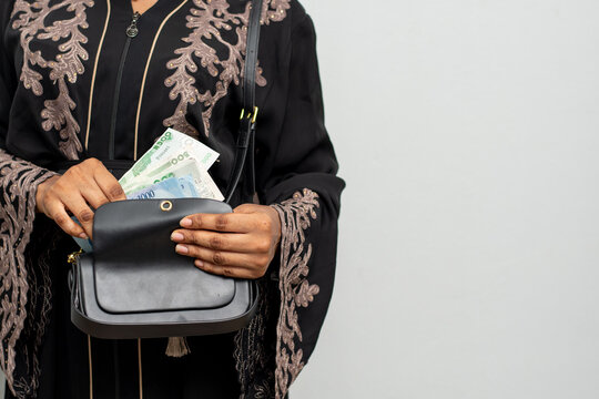 young black woman putting money in her her purse