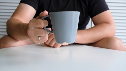 Young man puts the gray mug on the table. Concept of morning routine, morning ritual, mindful living. Everyday action. Human contact with an object. High quality photo.