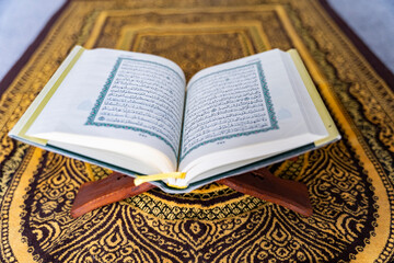 Asian Indonesian Muslim kid is reading the Quran. The Quran is indicated as the guided book for all Muslim and it is direction  to be on the heaven of God.Mosque,Islam,religion and knowledge concept.