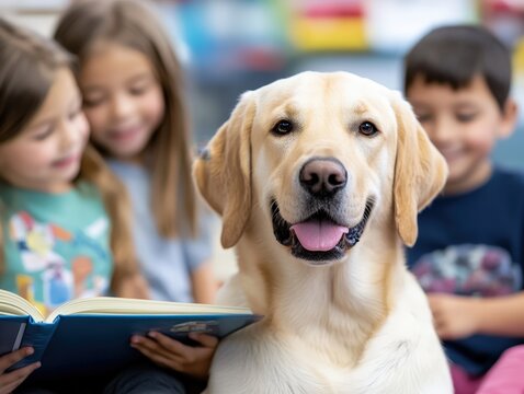 A cheerful Labrador retriever joins children in a reading session, illustrating the warmth, inclusivity, and educational joy of shared literary experiences.