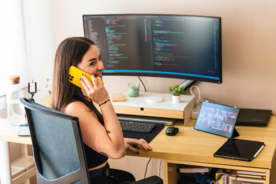 Modern home office with triple monitor setup and city view
