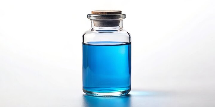 Clear glass reagent bottle with a screw-top lid, filled with a blue liquid, against a white background.