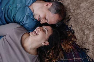 Closeup from above shots of two real type people laying on the sand and enjoying company of each other