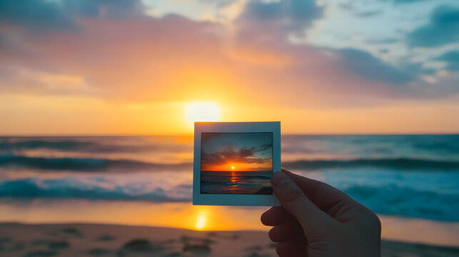 polaroid shot background featuring a hand holding an instant photo against a real beach sunset