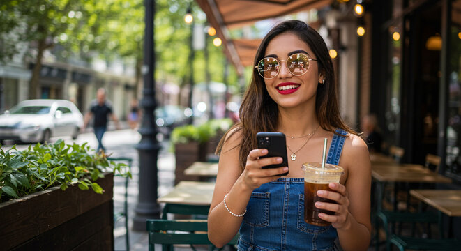 Influencer sipping cold brew coffee at an outdoor café, casually holding phone