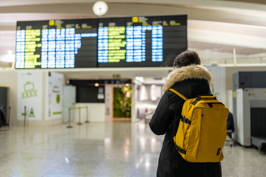 Tourist checking flight schedule on airport information board