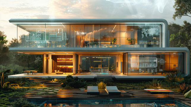 A futuristic house powered by solar cells with a transparent digital wall displaying real time global trade stats