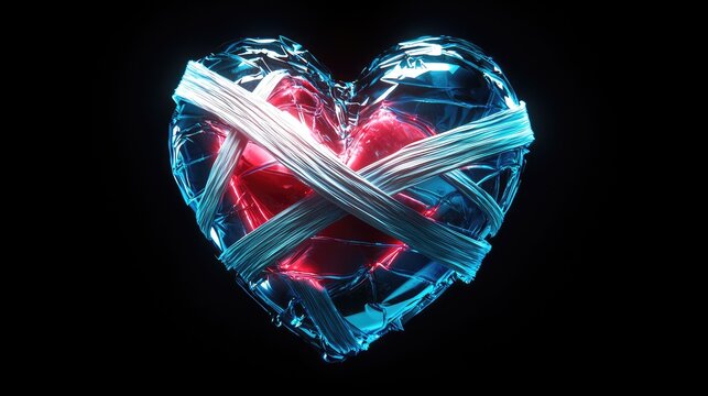 A blue İce heart wrapped in bandages with white edges, broken and red, illuminated by neon light on black background. Concept of lovecore
