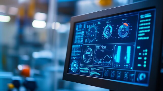 Closeup of a digital energy monitoring system displaying realtime consumption data on a screen with colorcoded graphs and figures indicating energy savings in manufacturing processes.