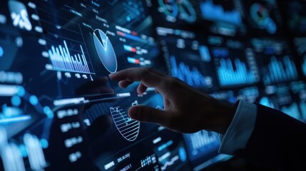 Man in suit using interactive high-tech system to study advanced digital graphs for business analytics
