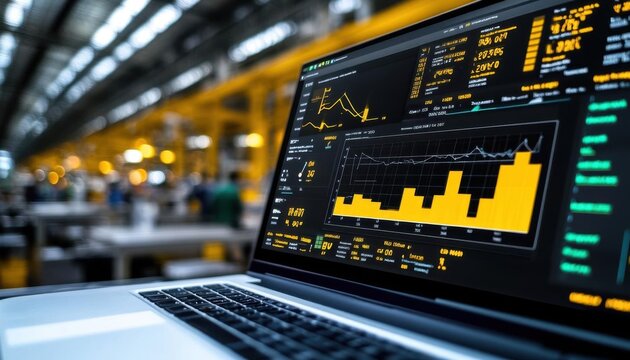Digital dashboard showing realtime quality control metrics in a factory, datadriven QC, realtime monitoring, background, no blur, photo not dark, everything is clear, copy space