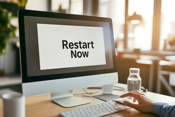Computer prompting a system restart with the text 'Restart Now' on the screen. The user's hand is on a computer mouse. Time to reboot.