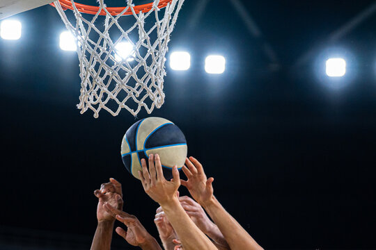A basketball hangs in the net of a hoop after a successful shot in an indoor basketball arena.