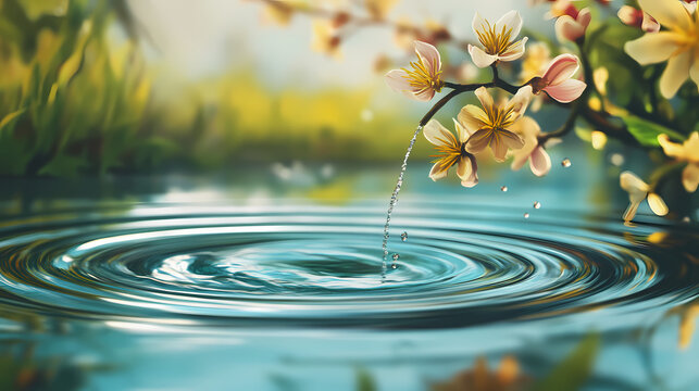 Balancing crystal water droplet forming concentric ripples on calm blue surface