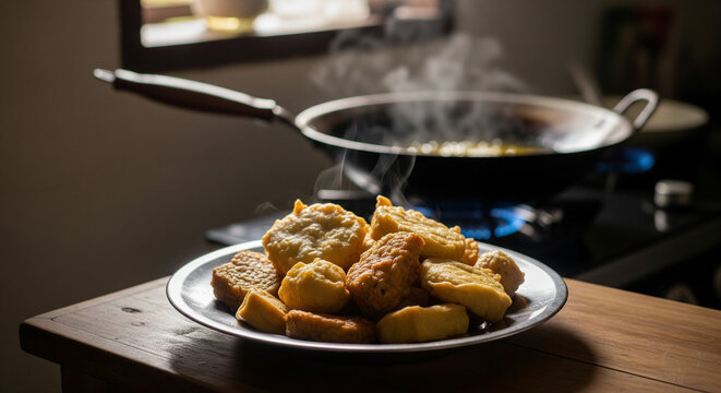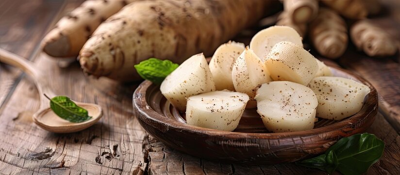 Traditional Malay dish ubi rebus or steam cassava placed on wooden background with selective focus for copy space image