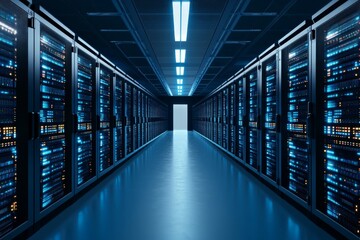 Rows of illuminated server racks receding into a dark, futuristic hallway