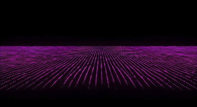 Abstract digital landscape with purple lines receding into the distance against a dark background.