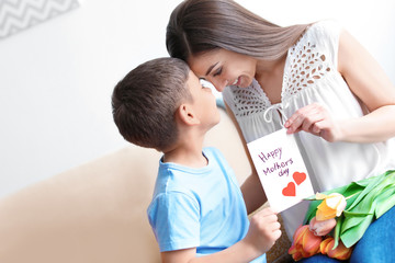 Boy giving flowers and card to smiling mom at home
