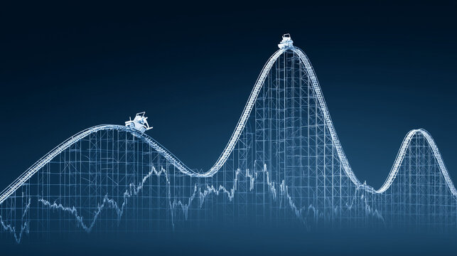 A financial stock chart as a roller coaster, symbolizing market volatility, investment risk, and uncertainty.