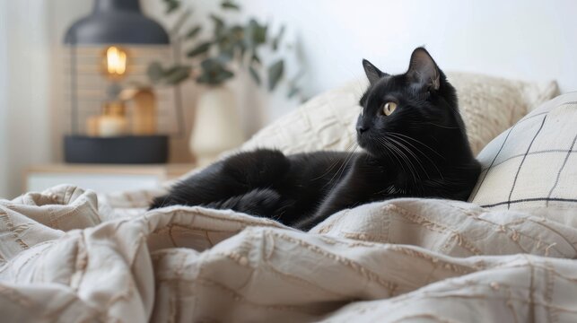 An elegant photograph of a black cat reclining on a bed with minimalistic and stylish decor in the background, embodying grace, restfulness, and modern interior design.