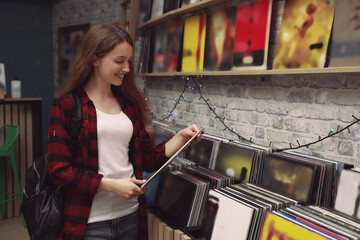Music store for vinyl records. Buying vintage records. Music, old school, retro concept.