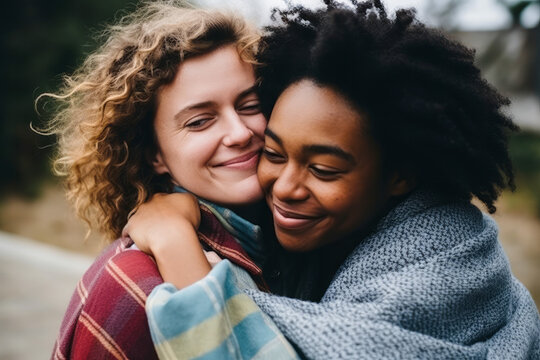 Two diverse female friends or partners hugging each other, after reaching an understanding or compassion, symbolizing making up after a fight