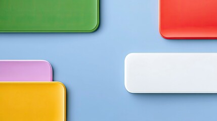 Abstract composition featuring colorful rectangles on a light blue background. Minimalist design with vibrant colors and clean lines.