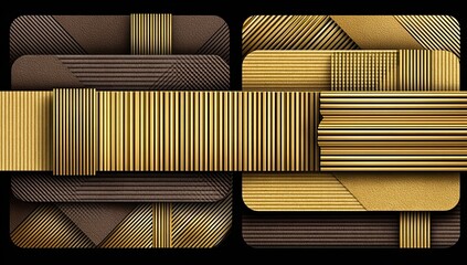 Abstract geometric design featuring layered squares and rectangles of brown and gold, with repeating striped patterns