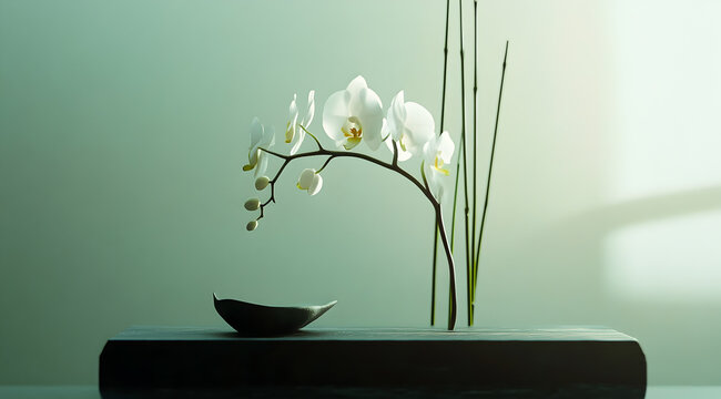 Delicate white orchid blooms gracefully arching over a dark rectangular base with minimalist decor