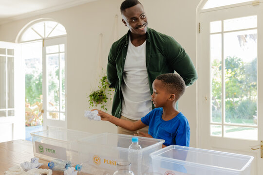African American father and son placing paper in bins labeled PAPER and PLASTIC at home