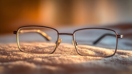 Close-up of rectangular eyeglasses resting on a textured surface, bathed in warm sunlight.