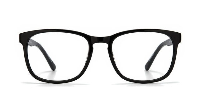 Close-up of black-framed glasses against a white background, featuring a classic, rectangular design and subtle shadow detail