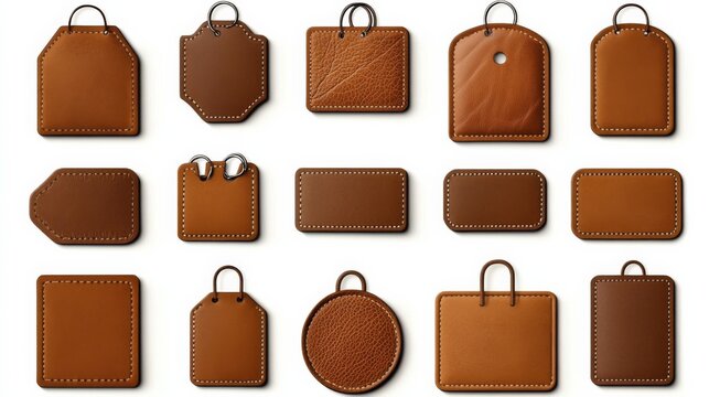 Variety of Brown Leather Tags in Grid Pattern - 12 Tags of Different Shapes and Sizes with Metal Hooks.