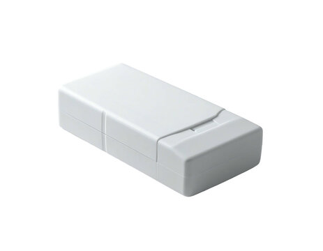Small, rectangular, off-white plastic device with a subtle hinge and a small, recessed button
