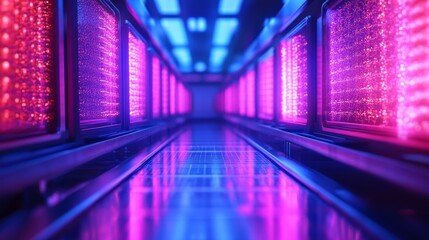 Tiled dark tech dashboard display showing glowing analytics panels with circular data dial