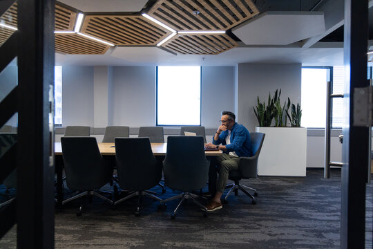 Smiling senior man wearing blue shirt standing in modern minimalist cozy home interior