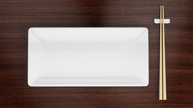 White empty slate rectangular plate and chopsticks on wooden table. 3d rendering