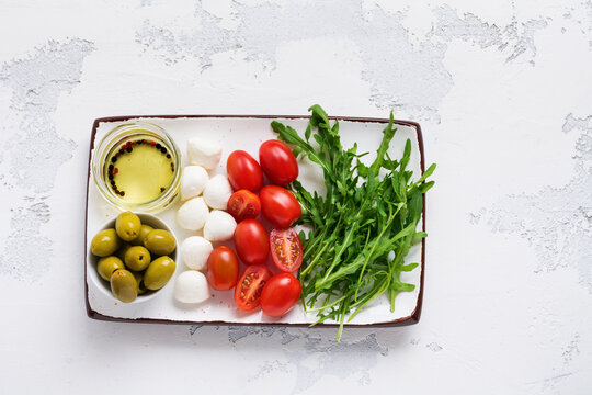 Mozzarella, cherry tomatoes and arugula served in white ceramic rectangular plates with olive oil over grey texture background. Flat lay