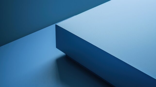 A close-up image of a simple geometric composition with blue hues, featuring a large, rectangular prism casting a shadow on a flat surface. The background is made up of soft blue tones, creating a sen