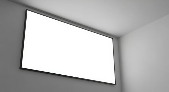 Blank white rectangular screen in interior with concrete floor. Presentation, movie theater and announcement concept. Mock up, 3D Rendering.