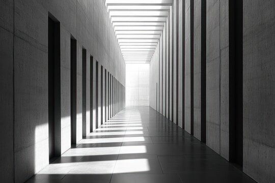 Long, minimalist concrete corridor bathed in sunlight filtering through rectangular skylights.