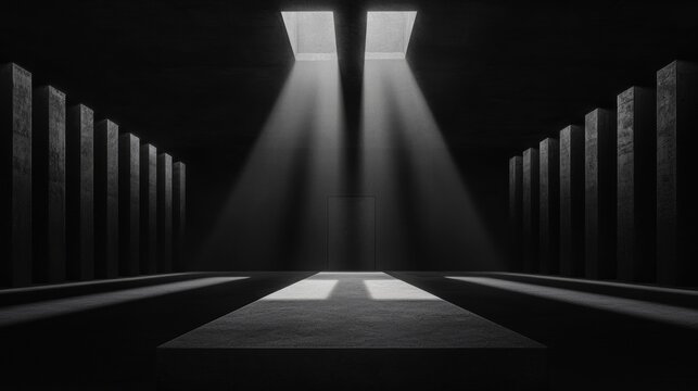 Minimalist Interior with Diagonal Skylights Casting Dramatic Light Beams - architectural photography