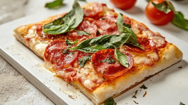 Square pizza on a white rectangular cutting board. the pizza has a golden brown crust and is topped with slices of pepperoni, melted cheese, and fresh basil leaves.