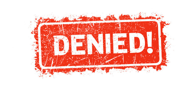Red 'DENIED' stamp with a distressed grunge texture in a rectangular frame, symbolizing refusal or restriction on a white background