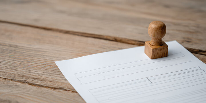 A wooden stamp rests on a blank form placed on a wooden surface. Documentation and approval