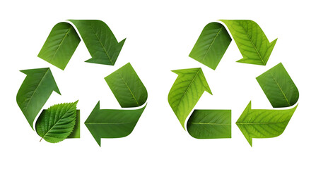 Two green recycling symbols made of leaves isolated on transparent background