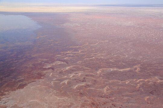 Africa, Tanzania, Aerial view of patterns of red algae and salt formations in shallow salt waters of Lake Natron